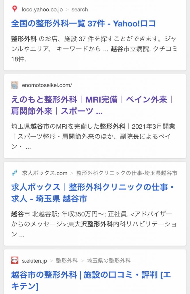 今まで「えのもと整形外科」で検索するとこの写真のようにテキストだけで写真は表示されませんでした。