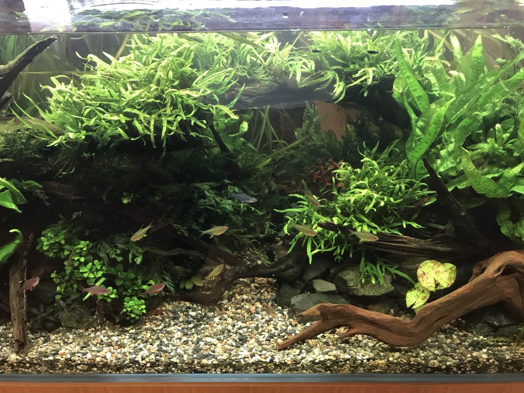 クリニックの水槽は成長の遅いシダ系で揃えていますので、黒くなった葉とか通水が悪そうなところを間引く程度のトリミングです。